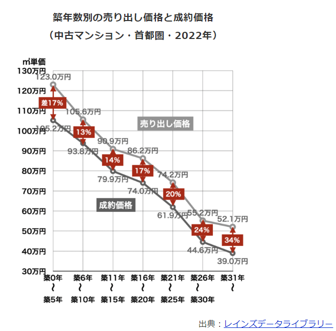 上記のグラフは、中古マンションの売り出し価格と成約価格の差を築年数別に示したものです。